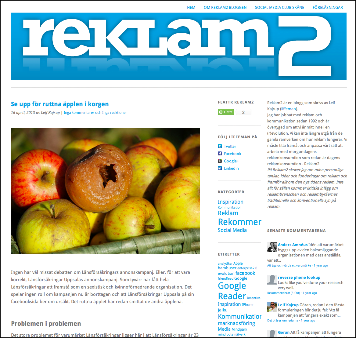 Ingen har väl missat debatten om Länsförsäkringars annonskampanj. Eller, för att vara korrekt, Länsförsäkringar Uppsalas annonskampanj. Som tyvärr har fått hela Länsförsäkringar att framstå som en sexistisk och kvinnoförnedrande organisation. Då det här, för mig handlar om varumärkestrategi så skriver jag istället om det på Reklam2-bloggen och hänvisar då till: http://www.reklam2.se/2013/04/se-upp-for-ruttna-applen-i-korgen/